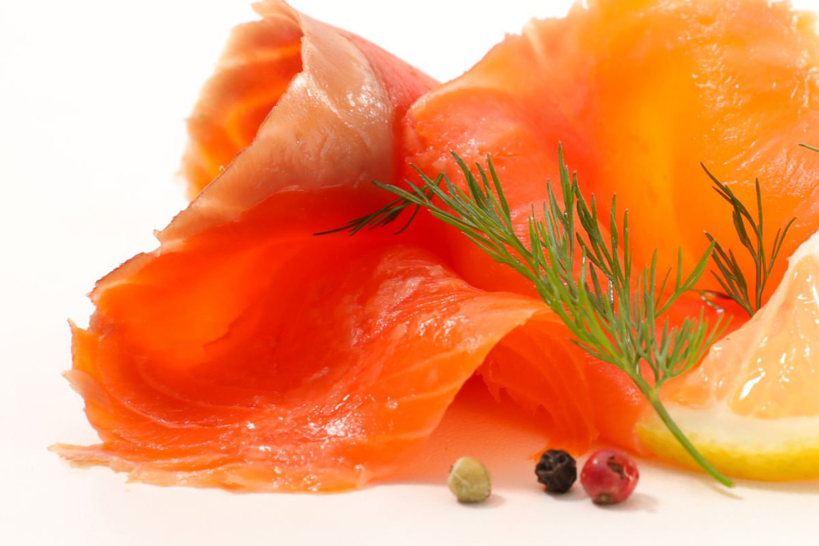 Zacht gerookte zalm met een verfijnde, licht ziltige smaak en een boterzachte textuur.